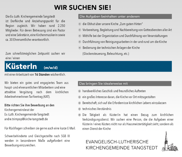 Gemeinsam macht es mehr Spaß: Auch in diesem Jahr soll der Pastorpark der Kirche Tangstedt wieder vom vielen Herbstlaub befreit werden, das sich in raschelnden Haufen auf dem Boden sammelt, Das schafft der Pastorpark leider nicht von allein. Damit er zu den besinnlichen Tagen am Ende des Kirchenjahres gut begehbar ist, freut sich die Kirchengemeinde Tangstedt über viele Helferinnen und Helfer zum gemeinsamen Pastorparkputz. Kommt allein, mit eurem besten Freund oder gleich mit der ganzen Familie. Und bringt gern eure Gartenhandschuhe, eine handliche Harke oder euren liebsten Laubbesen mit.